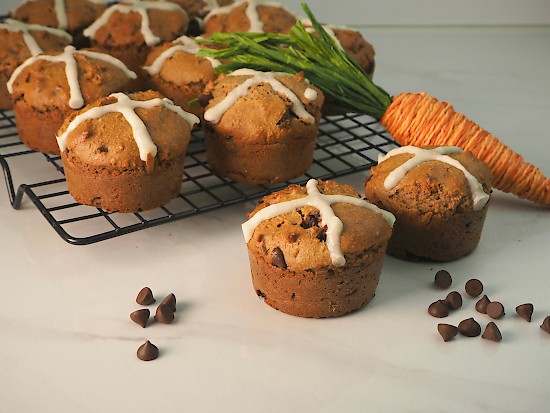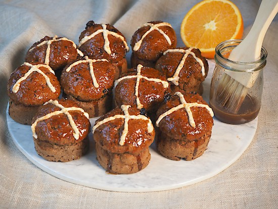 Hot Cross Muffin-Buns - You also have another choice of buns. This is my original grain-free Hot Cross Bun/muffin recipe, it's made with delicious moist almond meal/flour and organic sultanas. This is a quick recipe that cooks well in muffin tins.