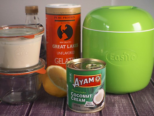 Lets have a look at what ingredients I use in each of my pot set yoghurts. A 270ml can of 100% full fat coconut cream, it's all natural with no additives, it's lovely and thick and comes in a BPA free can. (Another brand that's 100% natural and thick is Wokka - in Australia). All that's needed is 1/2 teaspoon each, of grass fed gelatin (I use the Great Lakes brand) and arrowroot to thicken. 1 1/2 tablespoons of either lemon or lime juice (the citrus juice helps with neutralising the strong coconut flavour), 1 teaspoon of unprocessed honey for the probiotic to feed on and 1 teaspoon of organic vanilla extract for flavour. I use one dairy free probiotic capsule, if you choose to use a cultured yoghurt starter it will be more sour, so I recommend you shorten the fermenting time. The coconut cream, gelatin and arrowroot will need to be heated in a small saucepan and whisk until you nearly reach boiling point to dissolve the gelatin and arrowroot flour (if the arrowroot isn't dissolved you will be able to taste it and feel a little grit in your yoghurt). You then set it aside to cool for 15 minutes before adding remaining ingredients and put aside to ferment. Easy peezy! Click here for recipe!