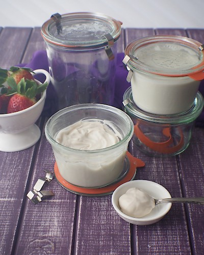 As I said previously it's much better for your health to store your food in glass. Weck preserving glass containers have seals and clips, which work well for fermenting. The 370ml Sturz style fits into the small 500ml Easiyo yoghurt maker and the 750ml size fits into the larger 1L size (double recipe for 750ml size). I purchased my jars from the Wheel and Barrow store but they can be purchased online from several suppliers (just do a Google search). I make a fresh jar every other evening after dinner, it doesn't take long at all. After heating the cream, I set it aside to cool while I clean up after dinner. The rest of the ingredients only takes 60 seconds to add while the kettle boils. Pop the hot water and sealed jar into your insulated container and leave over night.