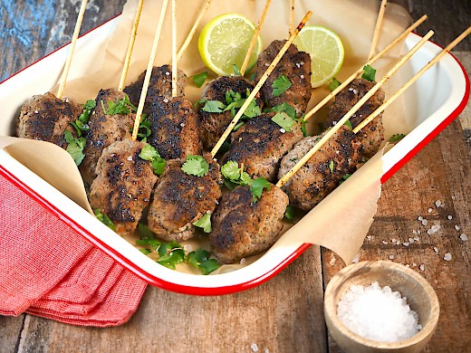 This is a tasty, no fuss way to prepare beef patties for a picnic. Prepare the Barbecue Beef Skewers ahead by cooking on a BBQ or in a large frying pan, then chill. They are flavoured with fresh herbs, lime zest and tamarind paste, giving a lovely hint of a sweet and sour flavour. They are a perfect finger food for a picnic. Serve with my homemade tomato sauce or your favourite dipping sauce.