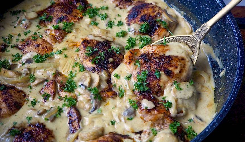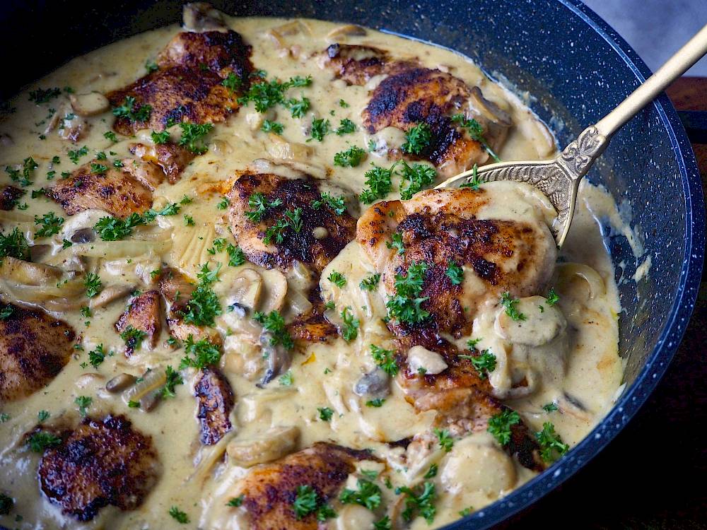 This dairy-free Paleo Chicken Stroganoff is packed with flavour, a delicious, comforting weeknight meal, that's cooked up in one pan. I've used skinless chicken thigh fillets but chicken breast fillets can also be used, you will just need a bit longer for them to cook through. It's a very low-carb meal when served with steamed vegetables or cauliflower rice.