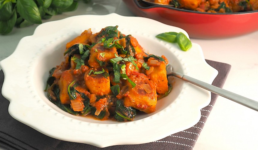Delicious sweet potato gnocchi is lightly fried to produce crispy little pillows with soft centres. I've coated the gnocchi in a creamy tomato and spinach sauce. I'm always happy when a recipe turns out just like, or even better than the traditional version. Serve with a green salad on the side. (I based the gnocchi on my Irish Potato Scone recipe).